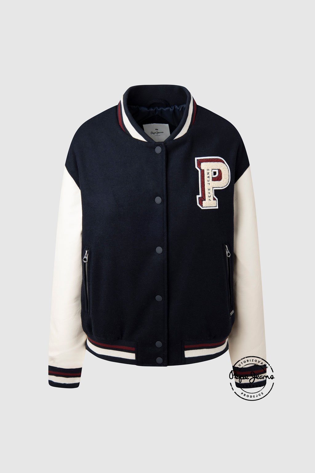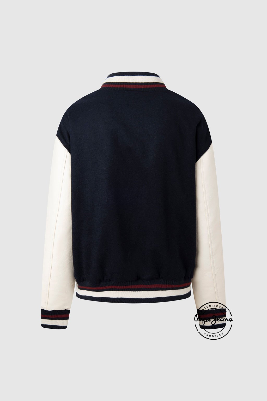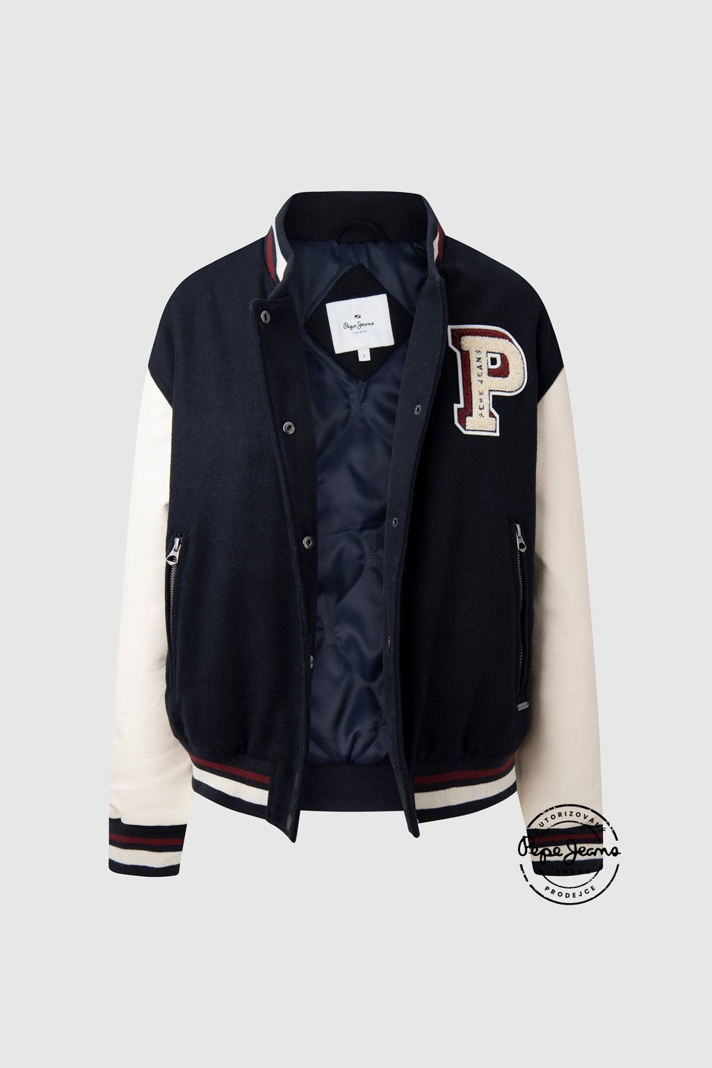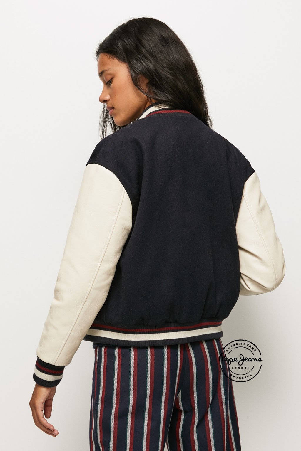 Varsity bomber bunda s kontrastními aplikacemi z froté materiálu na přední straně. Tělo je vyrobeno z měkké směsi vlny, rukávy z kontrastní P.U. látky. Límec, manžety i spodní lem zdobí pruhovaný žebrový náplet. Bunda má dvojité lemované kapsy na zip, zapínání na značkové patentky a uvnitř luxusní jacquardovou podšívku. Stylový kousek inspirovaný univerzitní módou.Doplňkové parametry