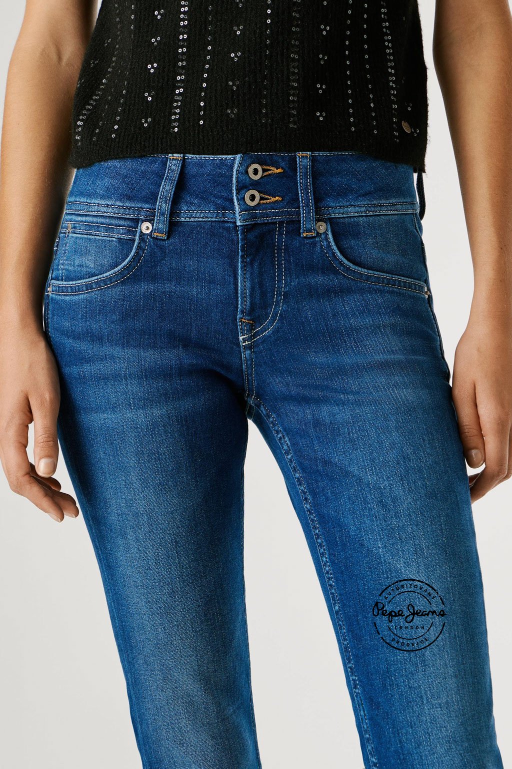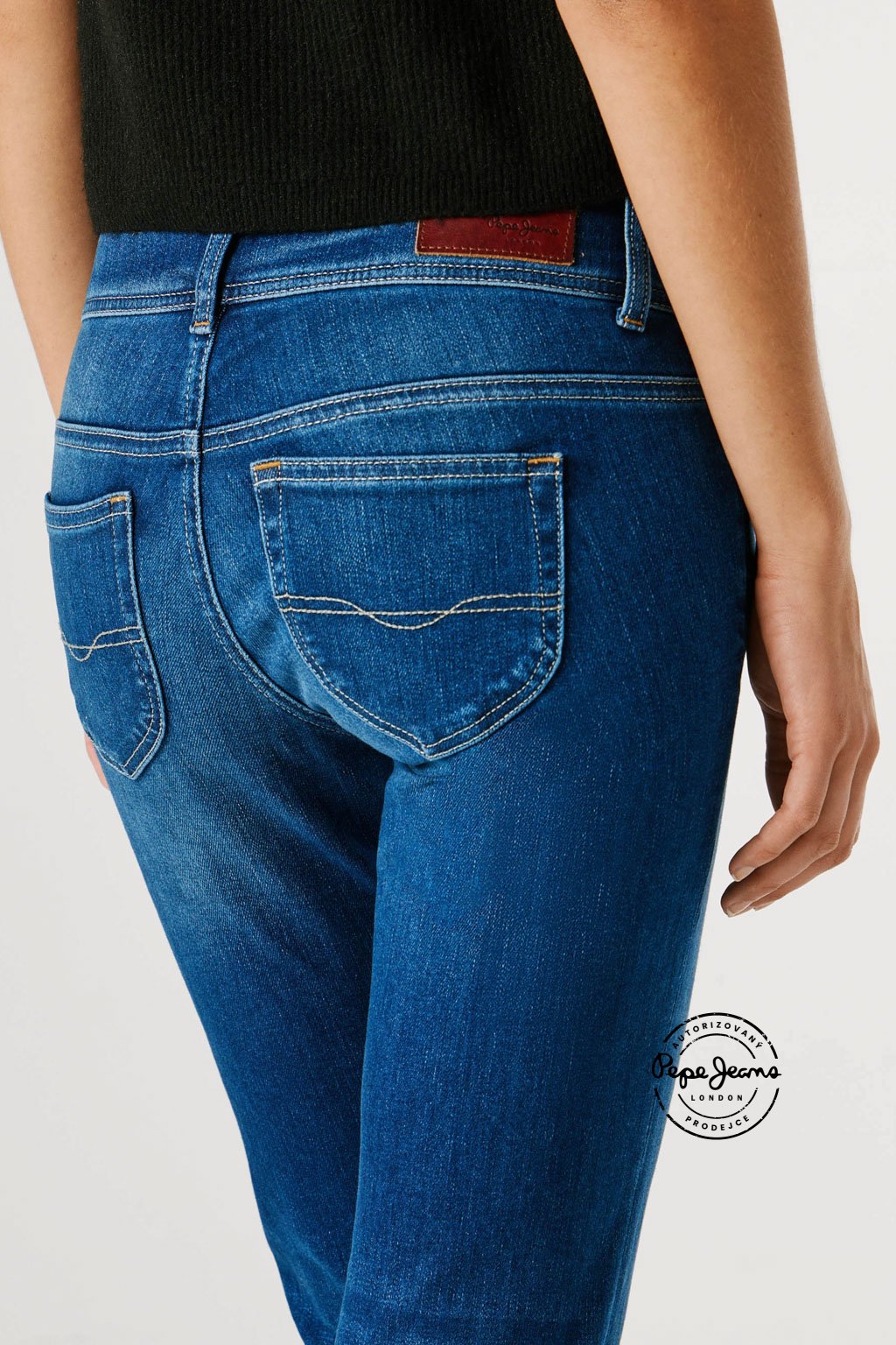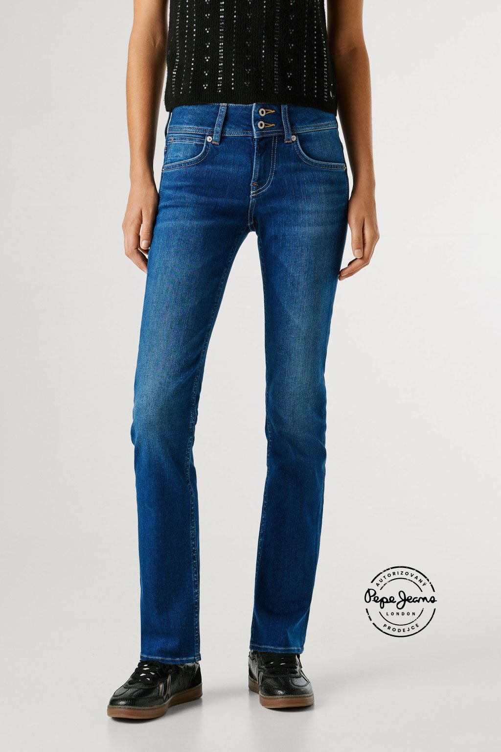 Slim džíny s nízkým pasem doplňuje detailní mincovní kapsička, širší pas s dvojitým zapínáním na dva knoflíky a zaoblené zadní kapsy, které lichotivě zvýrazňují postavu. Model představuje moderní pojetí ikonického střihu Venus. Džíny jsou vyrobeny z hladké směsi s příměsí modalu v kvalitě Powerflex, která nabízí vysoký komfort a pružnost, a doplňuje je jemně obnošený efekt v ikonickém odstínu Pepe blue indigo.