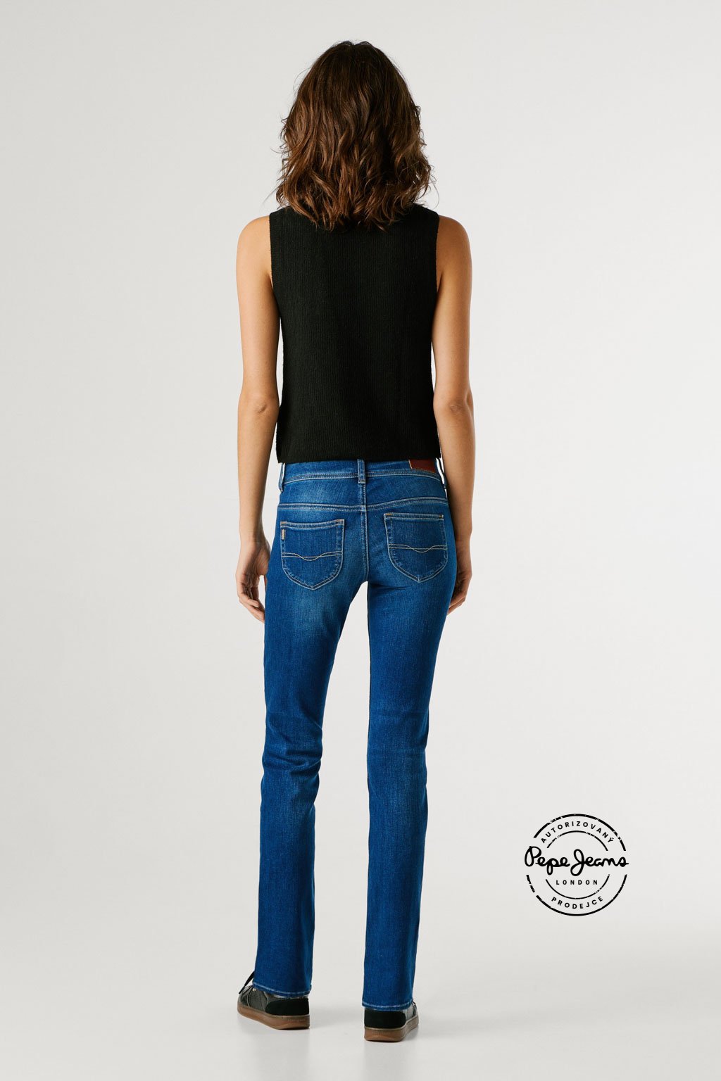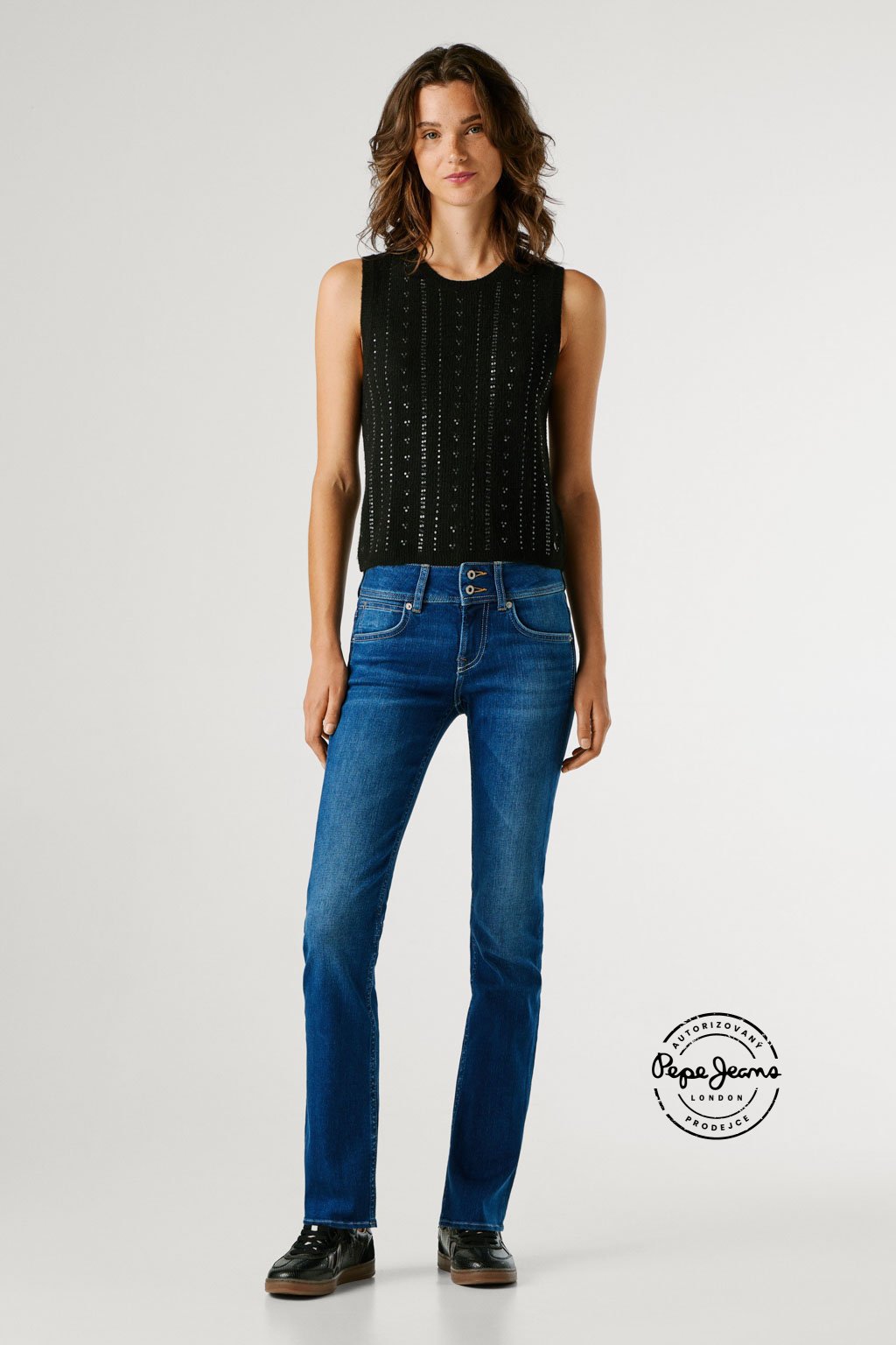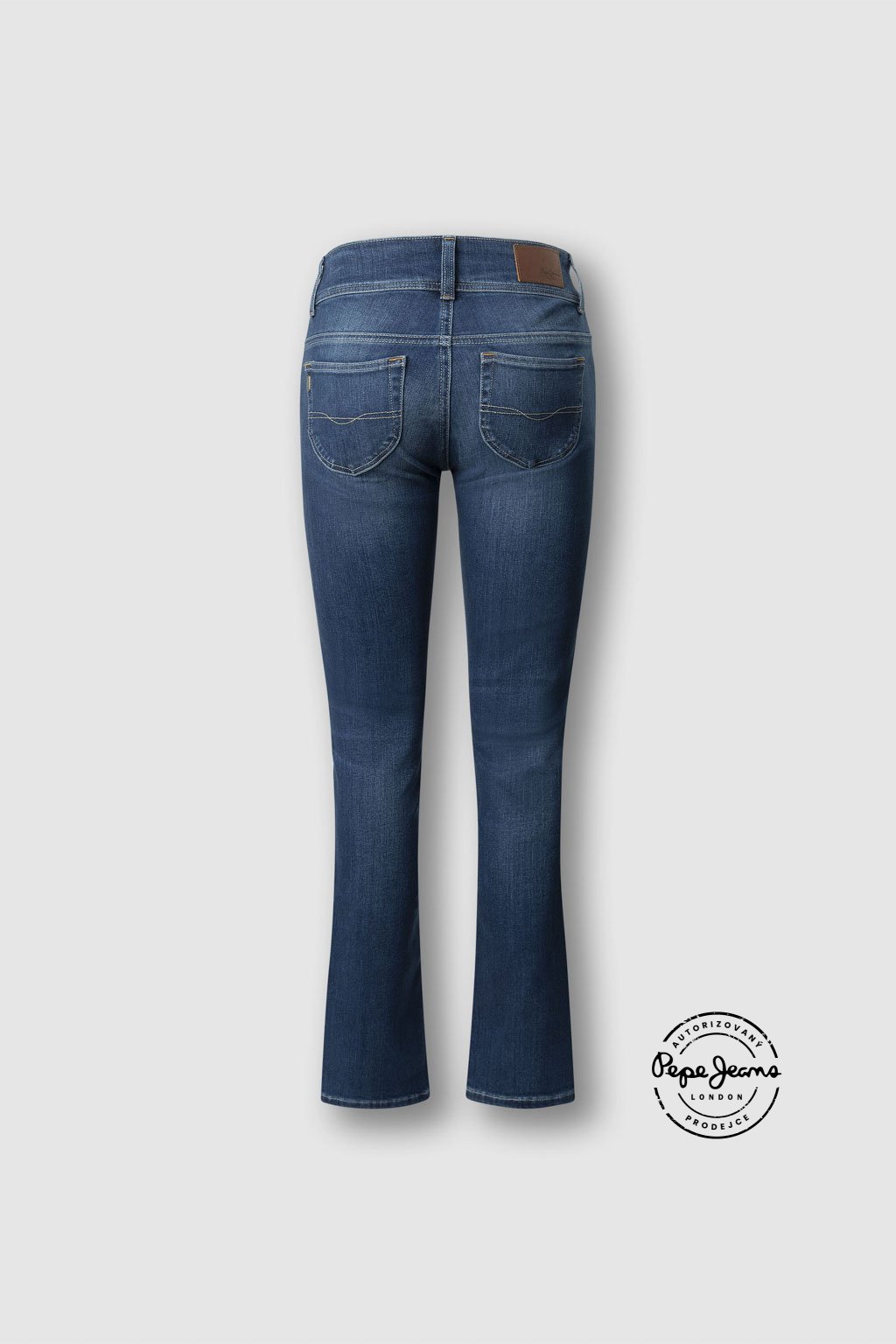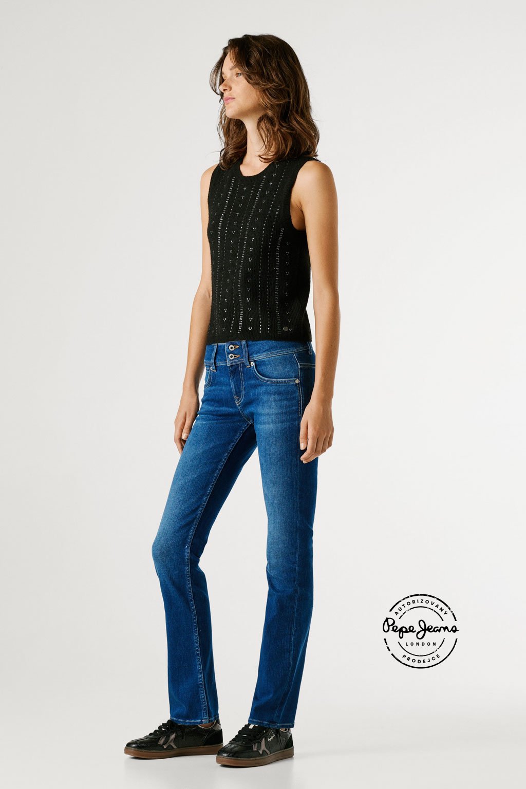 Slim džíny s nízkým pasem doplňuje detailní mincovní kapsička, širší pas s dvojitým zapínáním na dva knoflíky a zaoblené zadní kapsy, které lichotivě zvýrazňují postavu. Model představuje moderní pojetí ikonického střihu Venus. Džíny jsou vyrobeny z hladké směsi s příměsí modalu v kvalitě Powerflex, která nabízí vysoký komfort a pružnost, a doplňuje je jemně obnošený efekt v ikonickém odstínu Pepe blue indigo.