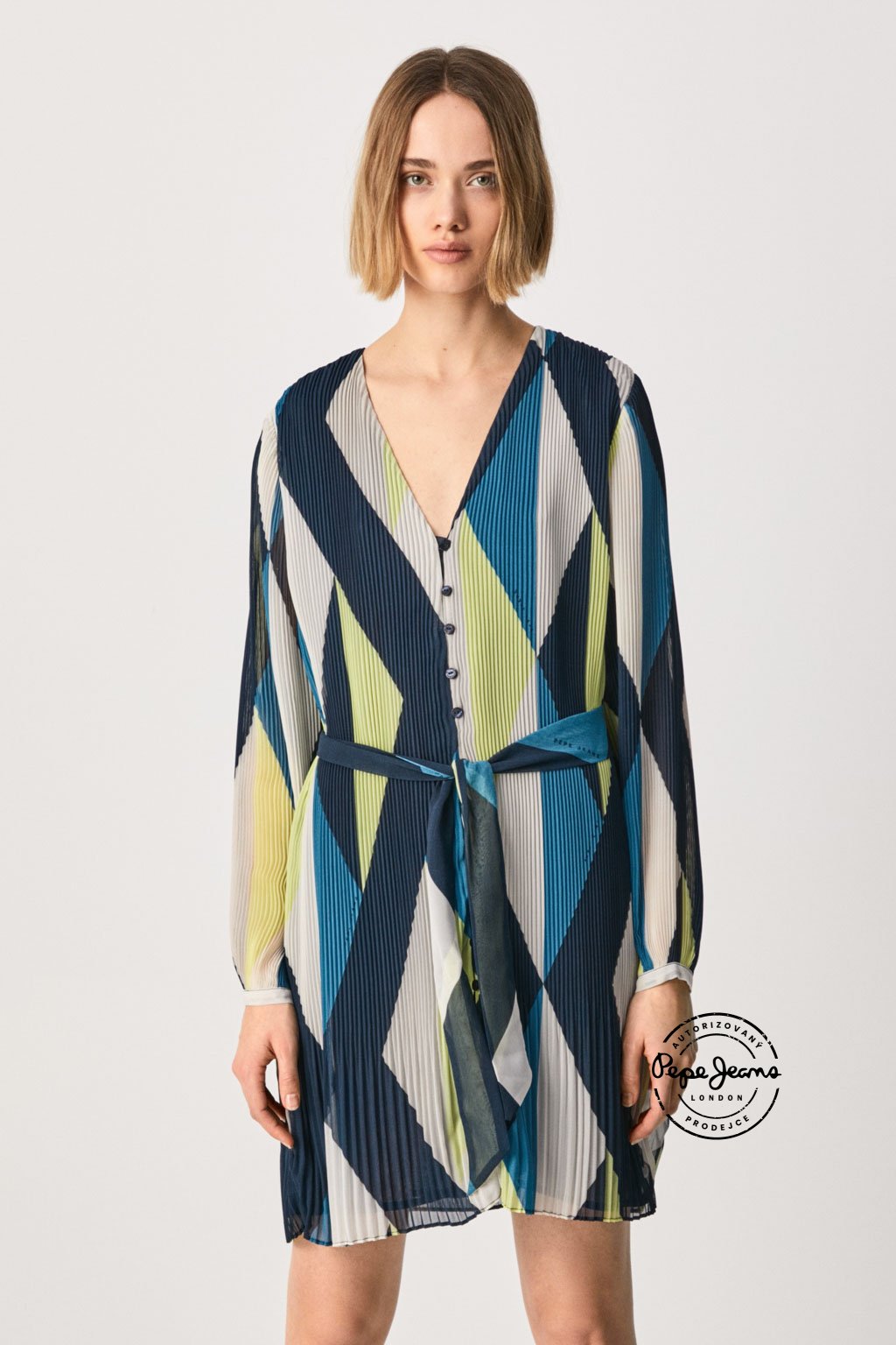 Košilové šaty z lehkého plisovaného šifonu mají skater střih, který krásně zvýrazňuje siluetu a působí vzdušně a ženským dojmem. Model zdobí geometrický vzor v jasných barvách, zapínání na knoflíky po celé délce a pásek v pase, který umožňuje upravit střih podle postavy. Dlouhé rukávy doplňují elegantní a zároveň výrazný design těchto šatů.Doplňkové parametry