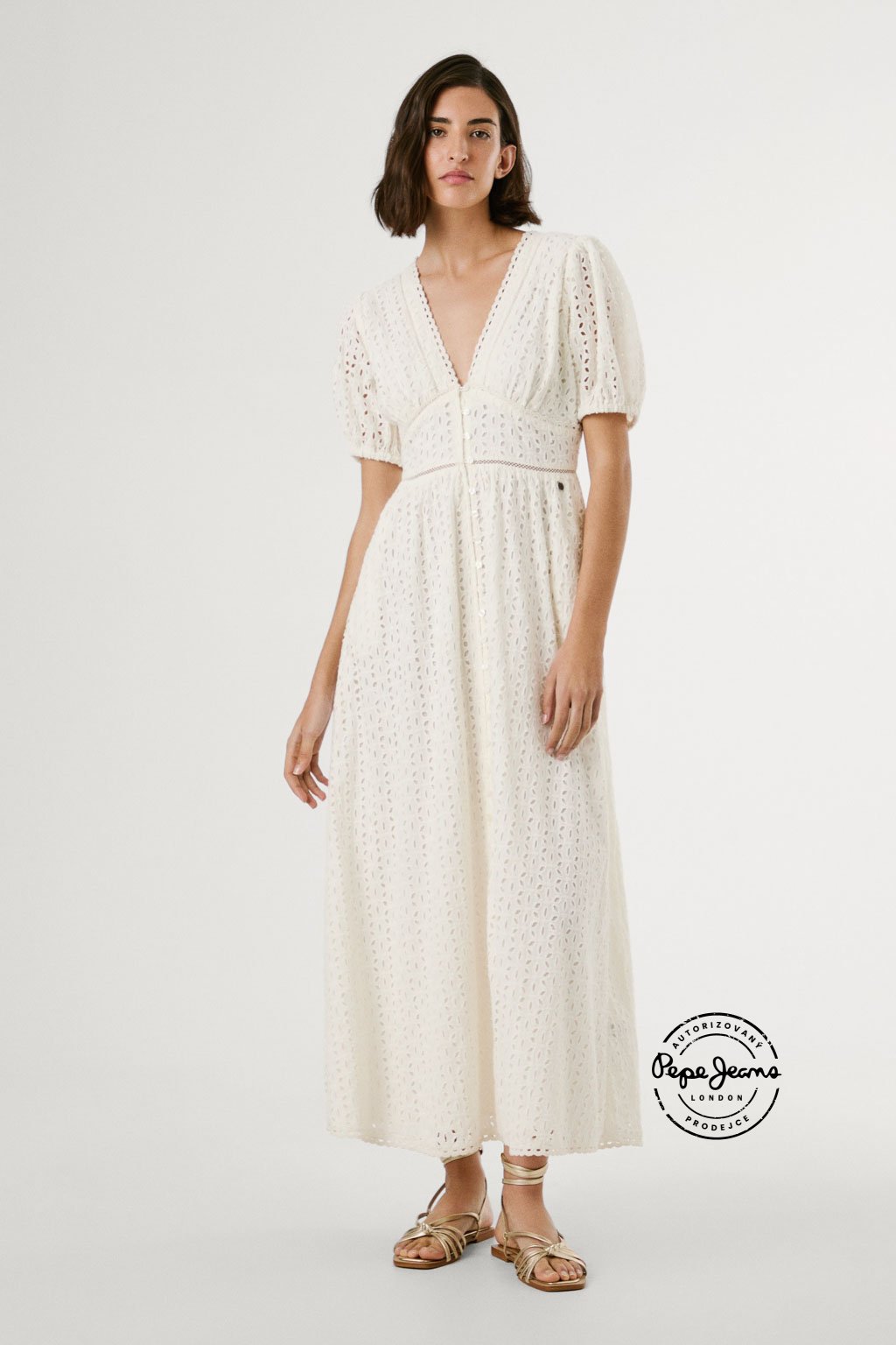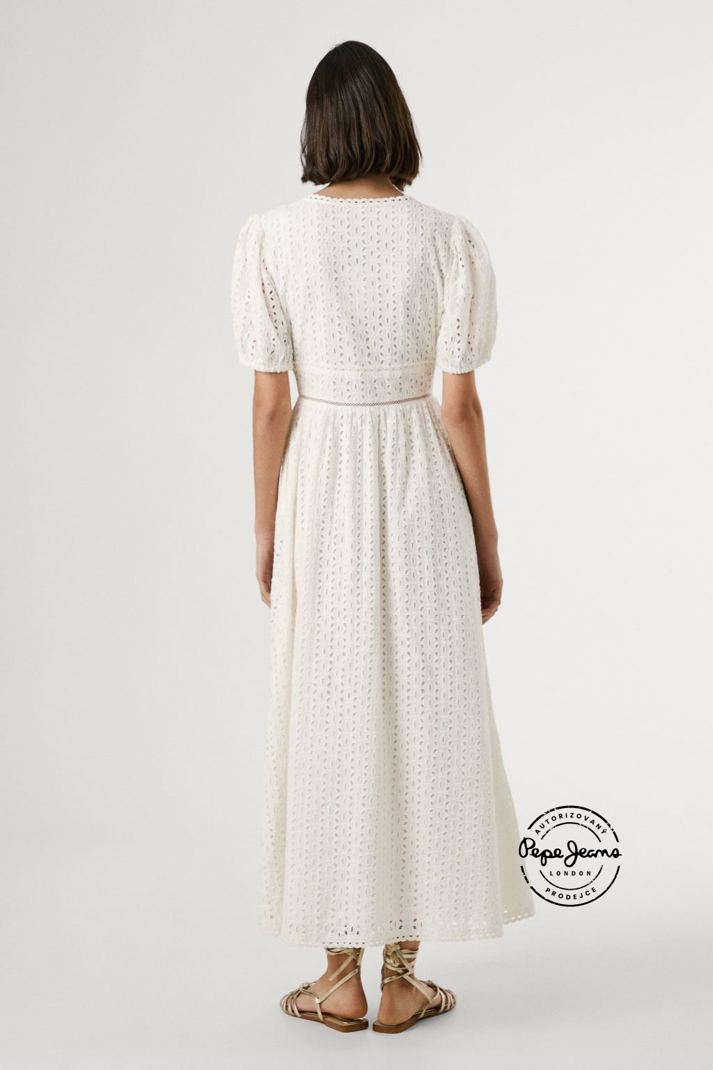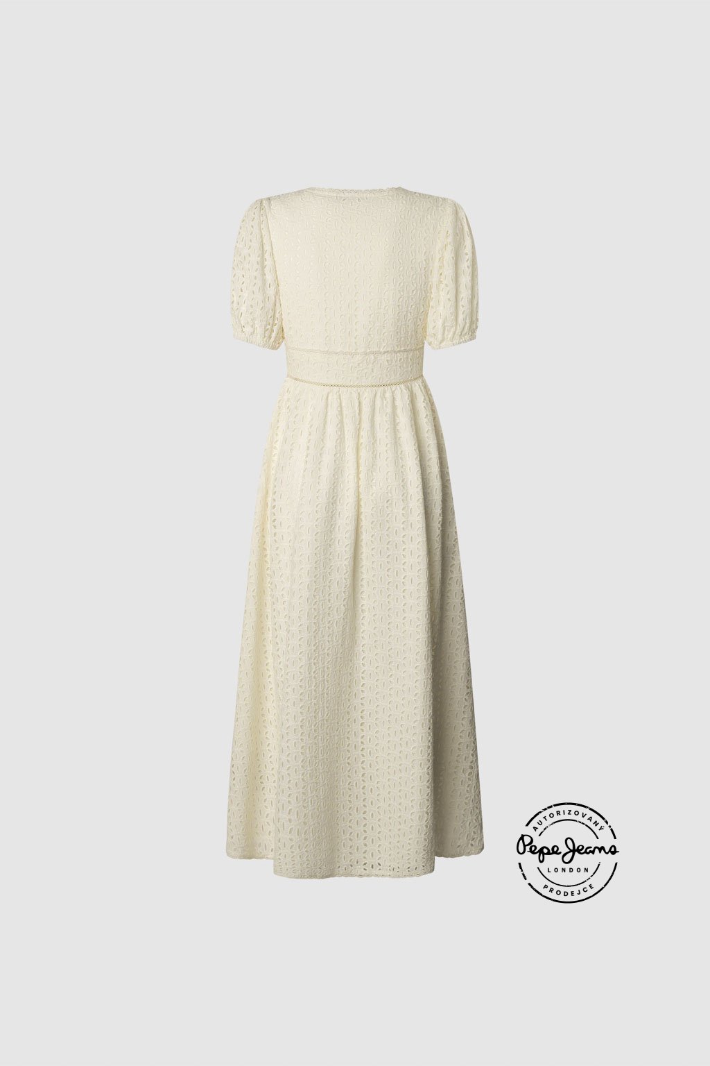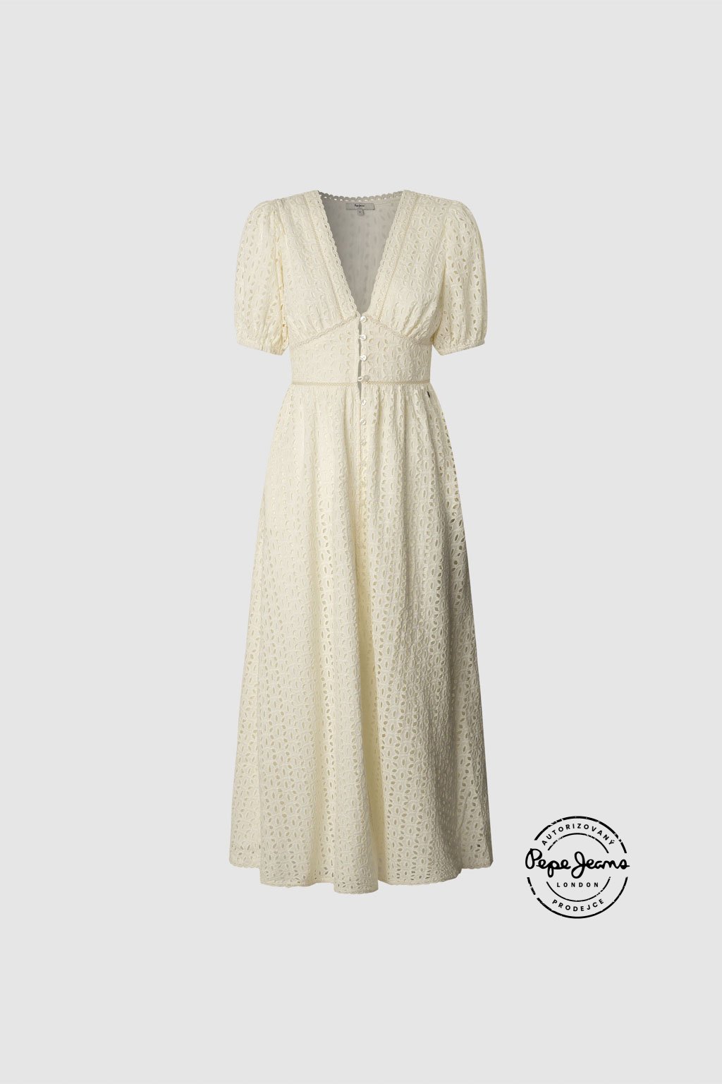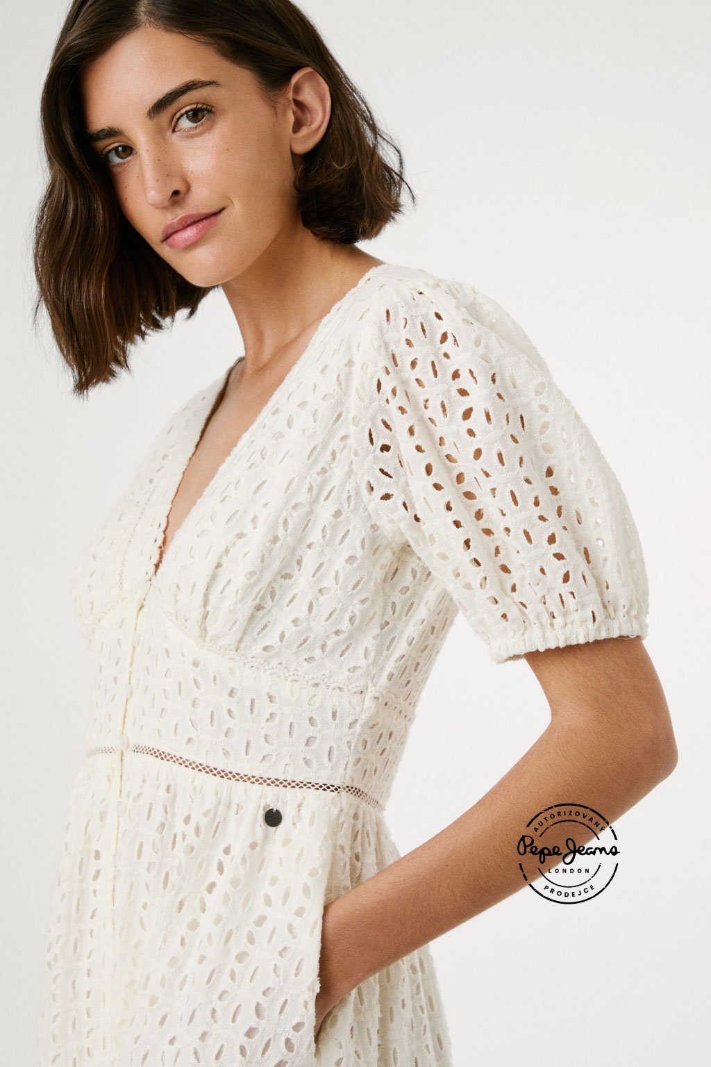 Krátké balónové rukávy, midi šaty s plně knoflíkovaným zapínáním na přední straně a v-výstřihem. Šaty jsou vyrobeny z očkované látky a zdobeny detaily v podobě šňůrek, což dodává celkovému vzhledu jemný a romantický nádech. Ideální volba pro letní dny nebo příležitostné nošení, které kombinuje pohodlí s elegantním stylem.Doplňkové parametry